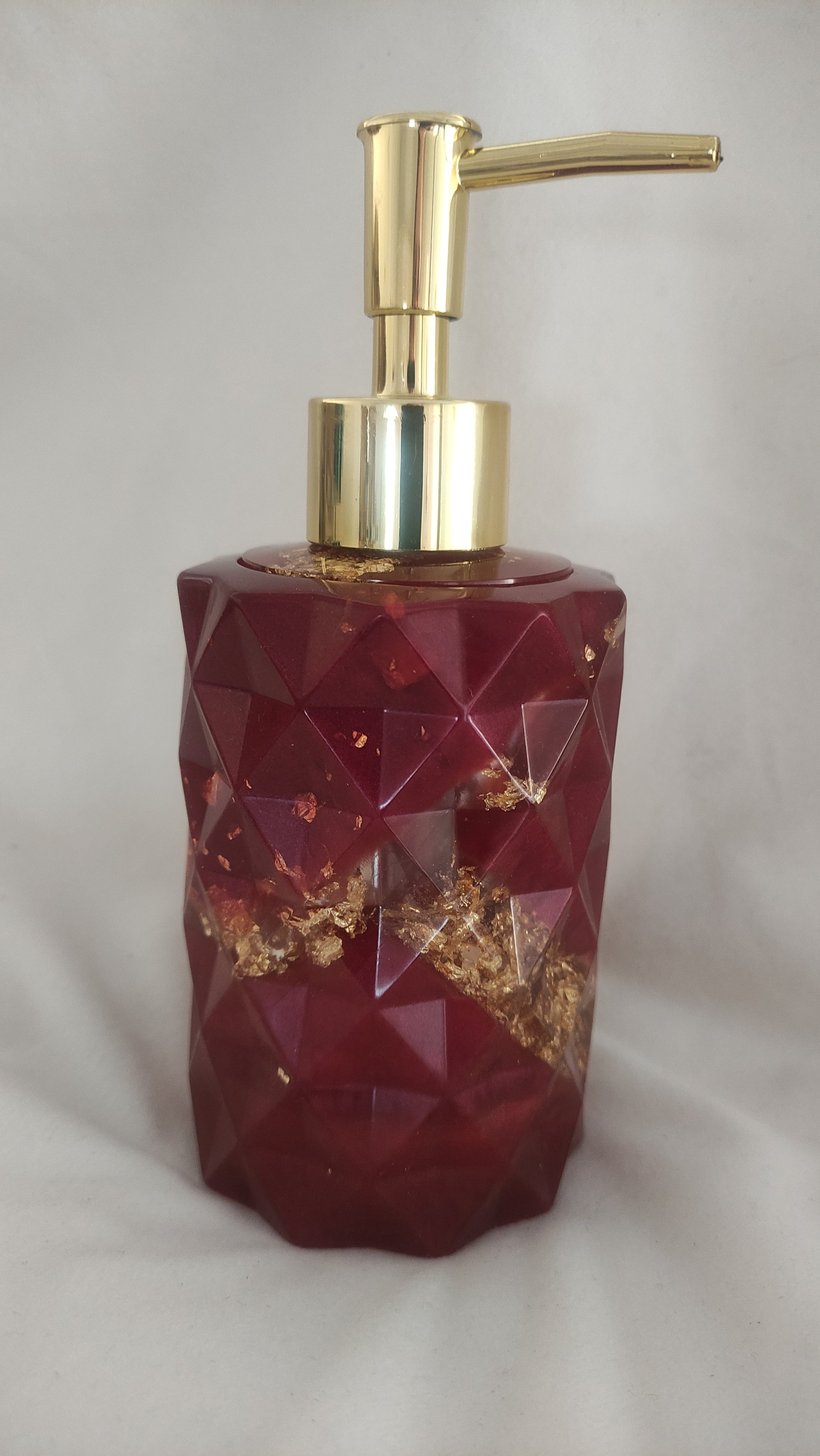 Wunderschöner Seifenspender in dunkelrot mit goldenen Akzenten.